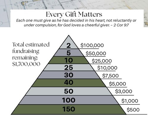 God has been so gracious to our church through the fundraising process, and we are continuing to see progress as we seek to complete this project debt-free. We have raised roughly $3.1 million towards our goal of $4.8 million. This month we shared an example of a donor giving pyramid reflecting the importance and impact of every gift. We continue to recognize that a project like this requires the unity of our body whether in giving, praying, or serving. On May 18th, we will take a special offering for the building project. We are so grateful for the support that members across our church continue to show as the project progresses.