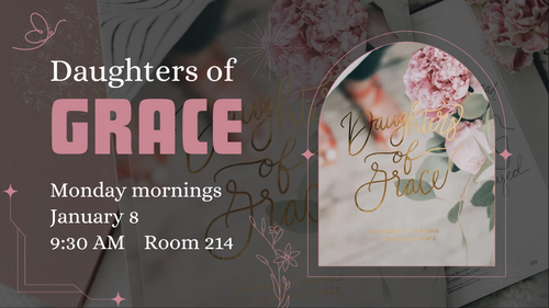 A new Monday morning Women’s Bible Study! Join us on Mondays at 9:30 AM in Room 214 beginning January 8 to go through the six-week study “Daughters of Grace".